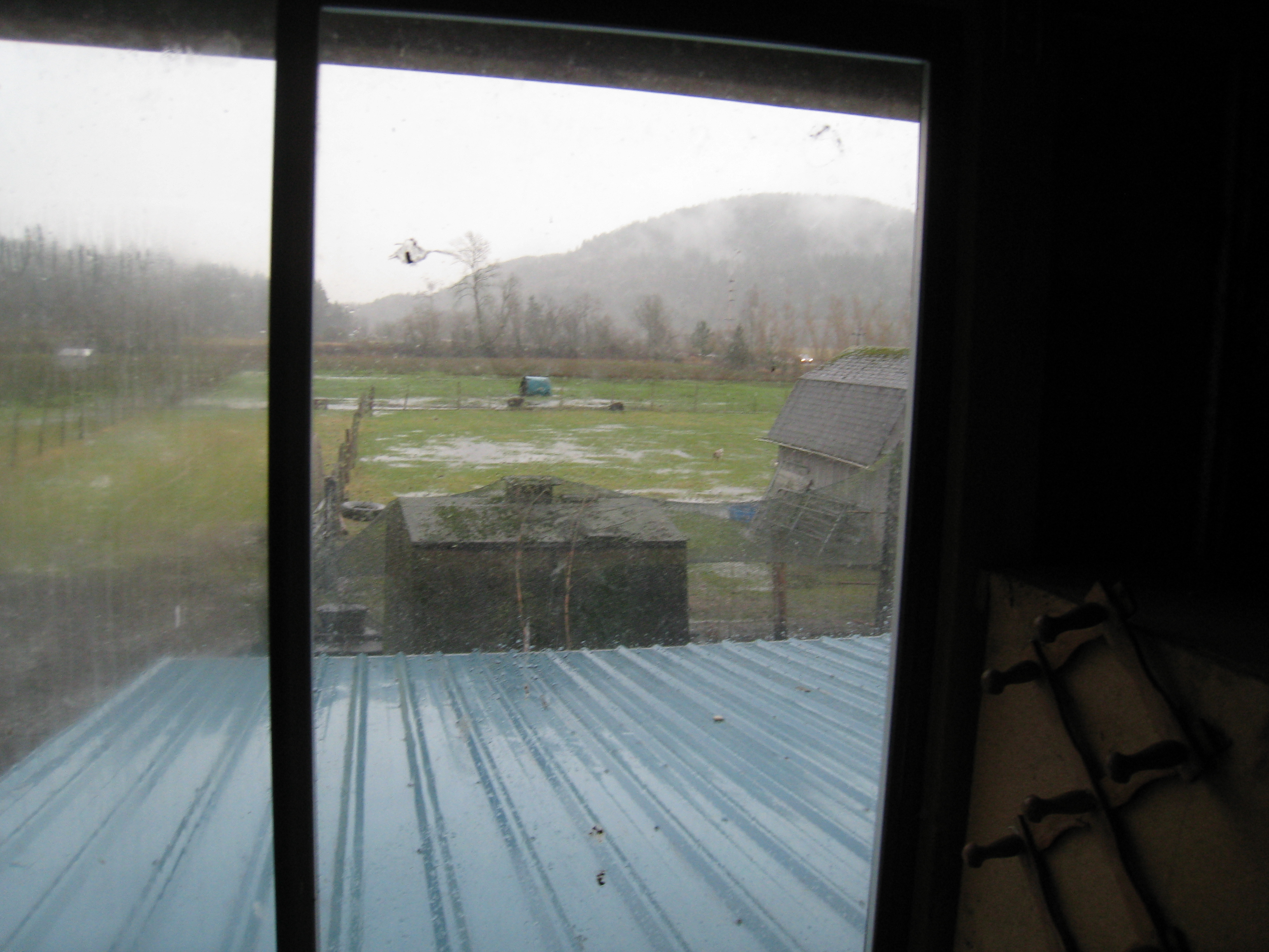 In other news, we had one day of no rain and then today it became gloomy and rained all day.  Here’s the view from the hay loft window.