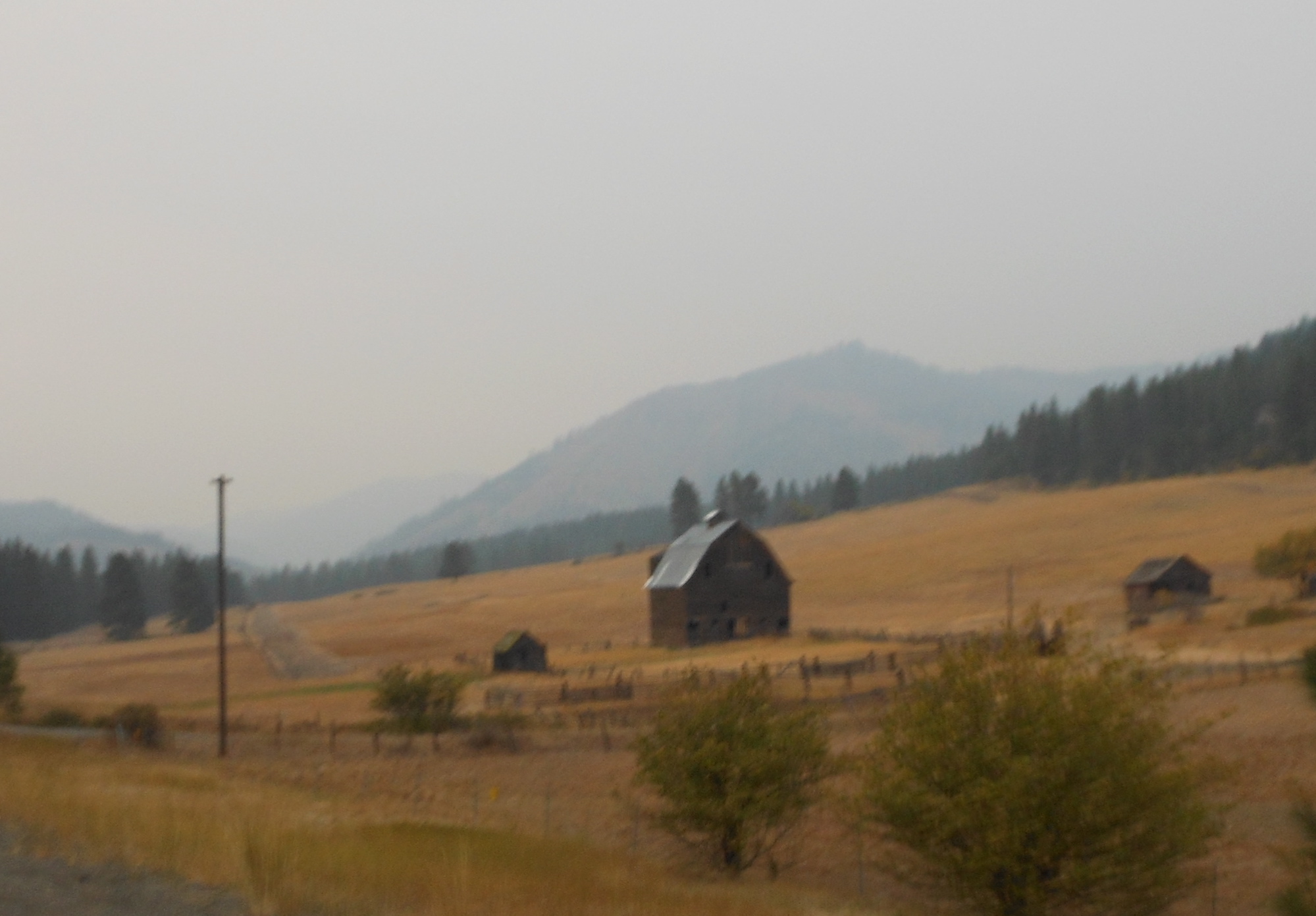 And here is a barn farther down in the valley with a lot of smoke from the fire behind it.